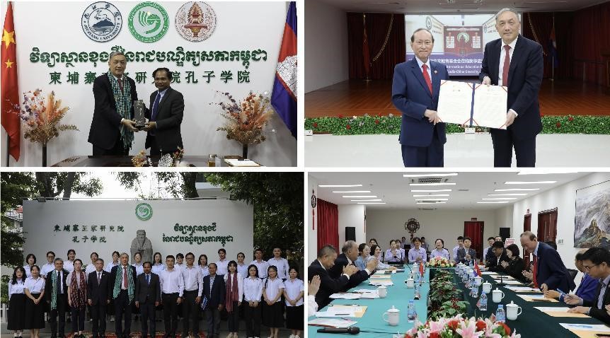 在柬埔寨期間,楊衛(wèi)理事長走訪了柬埔寨首家孔子學院—王家研究院孔子學院,及基金會成立后首批新設的孔子學院—柬華應用科技大學孔子學院。柬埔寨王家研究院孔子學院于2009年由時任國家副主席習近平親自揭牌,運行14年來已設立23個教學點,為當?shù)馗骱献鳈C構累計教授學員11萬名。王家研究院楊博秘書長表示,該所孔子學院正以數(shù)字化建設為中心、加強中文教學和文化交流能力,努力建設成為數(shù)字賦能、特色鮮明的全球示范性孔院。柬華理事總會方僑生會長介紹了柬埔寨中文教育發(fā)展情況,希望與基金會深度合作,共同創(chuàng)新中文教育辦學模式和人才培養(yǎng)模式。楊衛(wèi)理事長對兩所孔子學院發(fā)揮各自優(yōu)勢、開展特色教學給予高度評價。王家研究院孔子學院具有良好的社會影響力,通過不斷提升辦學質(zhì)量、加強數(shù)字化建設,充分發(fā)揮示范引領作用。柬華應用科技大學孔子學院開展的“中文+職業(yè)教育”本科層次學歷教育是培養(yǎng)應用型人才的好方式。兩所孔院朝著數(shù)字化、特色化方向創(chuàng)新發(fā)展,行穩(wěn)致遠,引領孔子學院發(fā)展潮流。